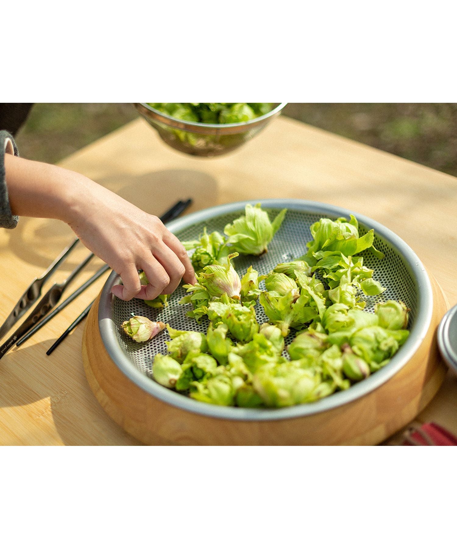 套餐內容 : 木板、淺型濾網、淺型碗尺寸 : Φ375×60(h)mm(組合時)重量 : 2.1kg素材 : 整合材、不鏽鋼